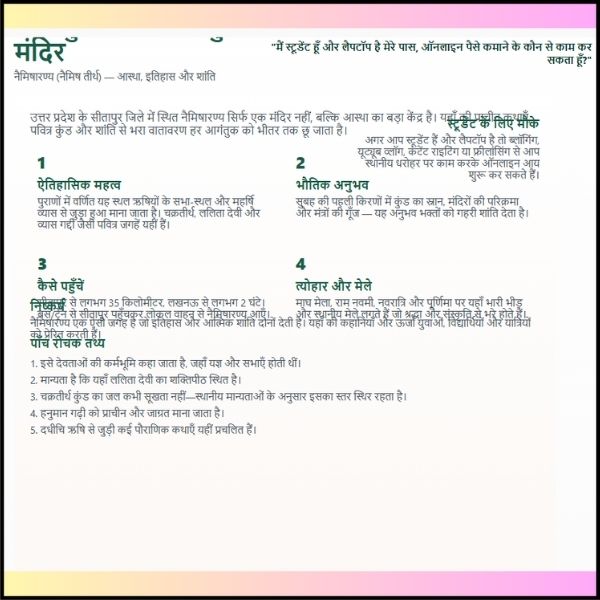 सीतापुर का नैमिषारण्य मंदिर सिर्फ एक धार्मिक स्थल नहीं, बल्कि आत्मा को छू लेने वाला अनुभव है। यहाँ का हर कोना इतिहास, भक्ति और शांति से भरा हुआ है। अगर आप एक बार यहाँ आते हैं, तो यह जगह हमेशा आपके दिल में बस जाती है। और अगर आप एक स्टूडेंट हैं, तो इस पवित्र भूमि से ऑनलाइन काम करके न सिर्फ अपनी पहचान बना सकते हैं बल्कि देश-दुनिया को अपने शब्दों से सीतापुर की महिमा से भी परिचित करा सकते हैं।