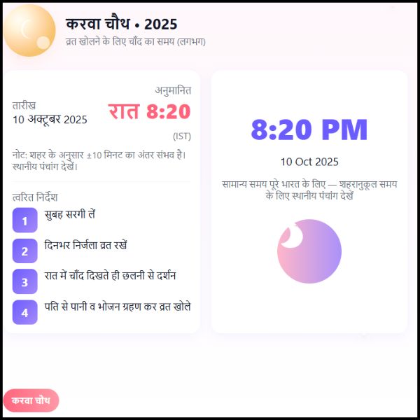 लेकिन औसतन कहा जाए तो पूरे भारत में 10 अक्टूबर 2025 की रात 8:15 से 8:30 के बीच करवा चौथ का चांद दिखाई देगा।