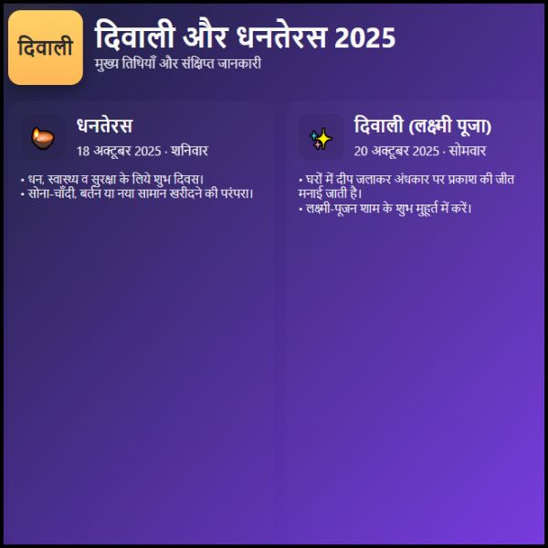 दिवाली और धनतेरस दोनों ही एक-दूसरे से जुड़े हुए त्योहार हैं। दरअसल, दिवाली पाँच दिनों का उत्सव होता है और इसमें पहला दिन धनतेरस से शुरू होता है। आइए, अब आपको बिल्कुल आसान भाषा में बताते हैं कि 2025 में धनतेरस और दिवाली किस तारीख को पड़ रही है, साथ ही इनके महत्व और परंपराओं की पूरी जानकारी।