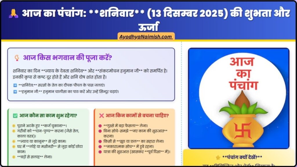 आज का पंचांग: मेरे प्यारे भक्त जनों हर दिन की शुरुआत अगर सही सोच और सही दिशा में हो जाए, तो पूरा दिन अपने आप बेहतर गुजरता है। हमारे शास्त्रों में इसी लिए आज का पंचांग देखने की परंपरा चली आ रही है। पंचांग सिर्फ तारीख बताने के लिए नहीं होता, बल्कि यह हमें बताता है कि आज किस भगवान की पूजा करें, कौन सा काम शुभ रहेगा और किन कामों से थोड़ी दूरी बनाकर रखना अच्छा होता है।