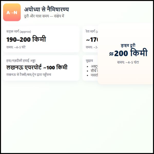 दोस्त, अब आपके मन में कोई कन्फ्यूजन नहीं रहना चाहिए कि अयोध्या से नैमिषारण्य की दूरी कितनी है। सड़क से करीब 190-200 किलोमीटर, ट्रेन से लगभग 170 किलोमीटर और समय करीब 4-5 घंटे का है। इन दोनों पावन स्थलों की यात्रा करना न सिर्फ आस्था से जुड़ा है बल्कि यह भारतीय संस्कृति और परंपरा को करीब से जानने का भी मौका है। अगर आप कभी अयोध्या जाएँ, तो नैमिषारण्य की यात्रा ज़रूर करें। यह सफर आपकी आत्मा को सुकून देगा और आपकी आस्था को और मजबूत बना देगा।