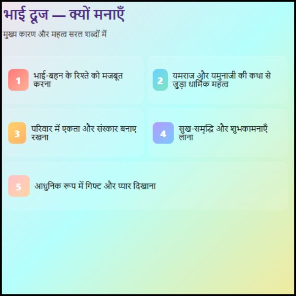 | भाई दूज क्यों खास है? | यह भाई-बहन के प्यार और सम्मान को दर्शाता है। |