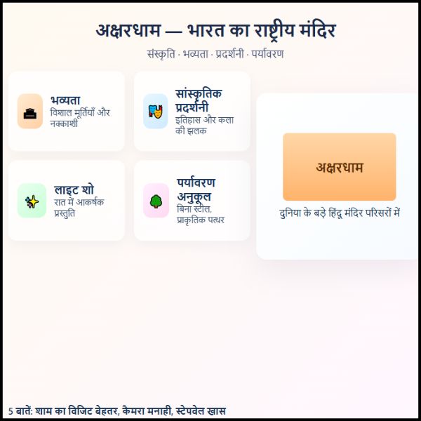 अक्षरधाम मंदिर की सबसे खास बात यह है कि यह सिर्फ पूजा का स्थान नहीं बल्कि एक सांस्कृतिक केंद्र भी है। यहाँ भारतीय इतिहास, परंपरा और संतों की शिक्षाओं को बहुत खूबसूरत तरीके से दर्शाया गया है।
