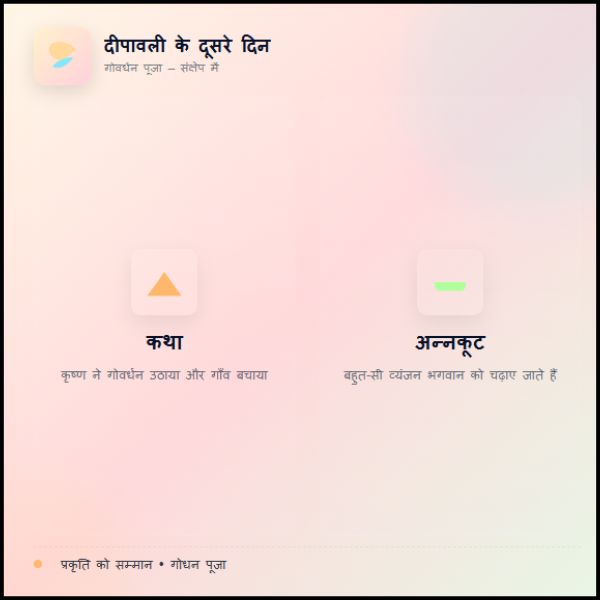 ग्रामीण क्षेत्रों में इस दिन गोबर से गोवर्धन पर्वत की आकृति बनाकर उसकी पूजा की जाती है, जिसे “अन्नकूट उत्सव” भी कहा जाता है। इस अवसर पर तरह-तरह के पकवान बनाए जाते हैं और भगवान को भोग लगाया जाता है। यह त्योहार हमें यह सिखाता है कि प्रकृति, पशु-पक्षी और धरती माता का सम्मान करना ही सच्ची पूजा है। गोवर्धन पूजा, दीपावली के उत्सव का आध्यात्मिक विस्तार है, जो हमें भगवान श्रीकृष्ण की विनम्रता और लोककल्याण की भावना की याद दिलाता है।