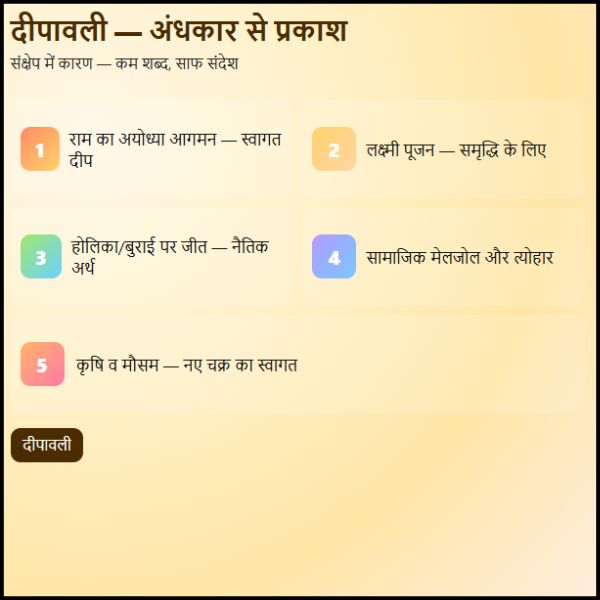 अब आप समझ ही गए होंगे कि दीपावली किस लिए मनाई जाती है। यह सिर्फ रोशनी और मिठाइयों का त्योहार नहीं है, बल्कि यह हमारी संस्कृति, परंपरा, धार्मिक आस्था और सामाजिक जुड़ाव का प्रतीक है। यह त्योहार हमें याद दिलाता है कि चाहे जिंदगी कितनी भी अंधेरी क्यों न लगे, अंत में जीत हमेशा रोशनी और अच्छाई की ही होती है।