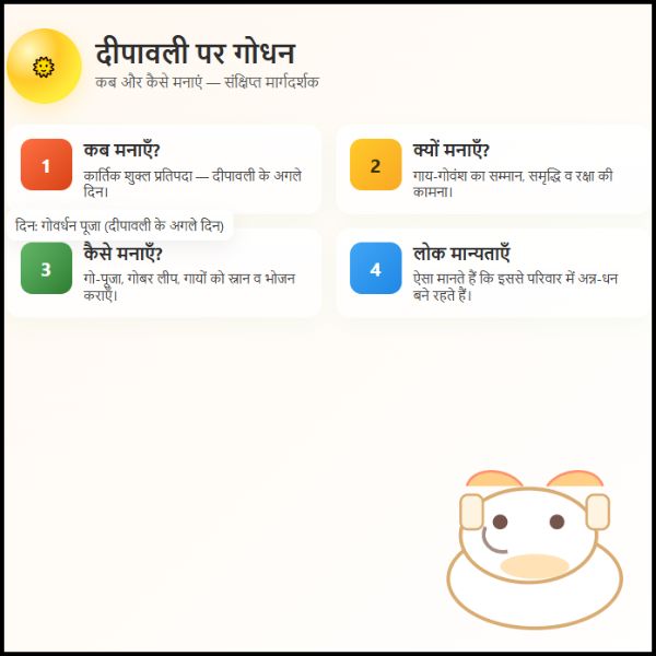दोस्त, अब आप समझ गए होंगे कि दीपावली पर गोधन कब और कैसे मनाया जाता है। यह सिर्फ एक धार्मिक क्रिया नहीं बल्कि प्रकृति और पशुधन के प्रति आभार व्यक्त करने का तरीका है। खासतौर पर गाँवों में इसका महत्व बहुत गहरा है क्योंकि वहाँ गायों को परिवार का सदस्य माना जाता है।