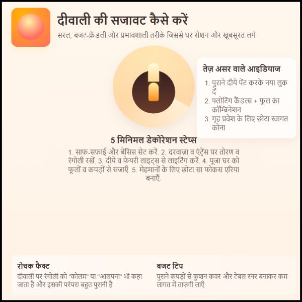 सजावट करते समय ध्यान रखें कि बहुत ज्यादा चीज़ें भरकर घर को अव्यवस्थित न बना दें। सादगी और संतुलन हमेशा खूबसूरत लगता है। इसके अलावा, बिजली की लाइट्स लगाते समय सुरक्षा का ध्यान रखें और दीयों को ऐसी जगह जलाएँ जहाँ बच्चों और पालतू जानवरों की पहुँच न हो।5 रोचक फैक्ट्स दीवाली सजावट से जुड़े?