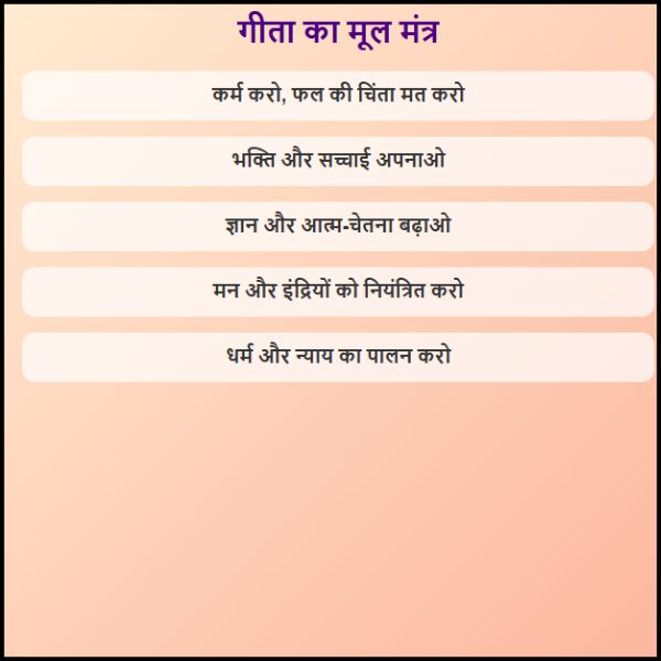 अब आते हैं असली सवाल पर — गीता का मूल मंत्र क्या है?। दोस्त, इसे बहुत सरल भाषा में समझें तो गीता का मूल संदेश है: