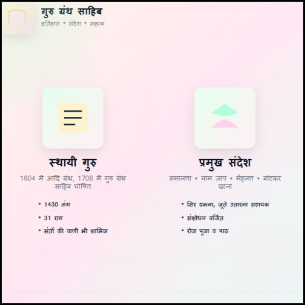 गुरु ग्रंथ साहिब सिर्फ एक धार्मिक ग्रंथ नहीं बल्कि पूरे सिख धर्म का शाश्वत गुरु है। यह किसी इंसान द्वारा दी गई गुरु-गद्दी की तरह नहीं बल्कि हमेशा के लिए आध्यात्मिक मार्गदर्शक के रूप में स्वीकार किया गया है। इस ग्रंथ में जीवन जीने के मूल्य, प्रेम, समानता, सत्य, ईमानदारी और ईश्वर के प्रति भक्ति का अद्भुत संदेश मिलता है।