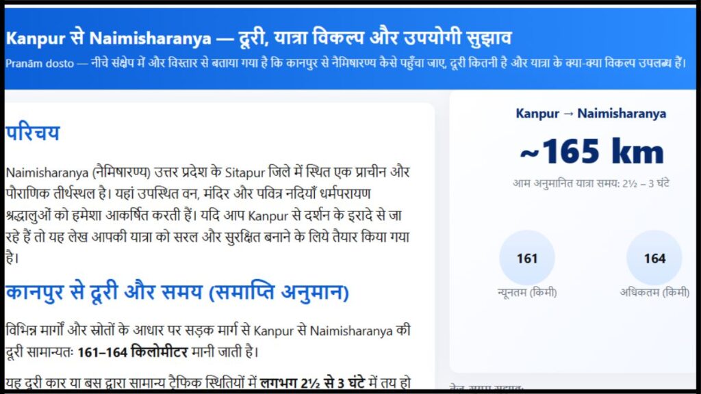 अगर आप Kanpur से Naimisharanya जाने की सोच रहे हैं — तो यह लेख आपको दूरी, यात्रा के विकल्प, समय-लगान तथा सुझावों सहित पूरी जानकारी देगी।