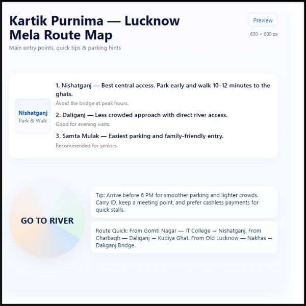 Kartik Purnima का ये मेला हर साल गोमती नदी के किनारे, Lucknow के विभिन्न घाटों पर लगता है—जैसे Kudiya Ghat, Hanuman Setu Ghat, Samta Mulak Chowk Ghat, Laxman Mela Ground, और कुछ सालों में शहर के अंदर भी अलग-अलग जगहों पर धार्मिक आयोजन हो जाते हैं। इसी वजह से Route Map समझना ज़रूरी हो जाता है, ताकि आप बिना किसी परेशानी के अपनी फैमिली के साथ पहुँच सकें।