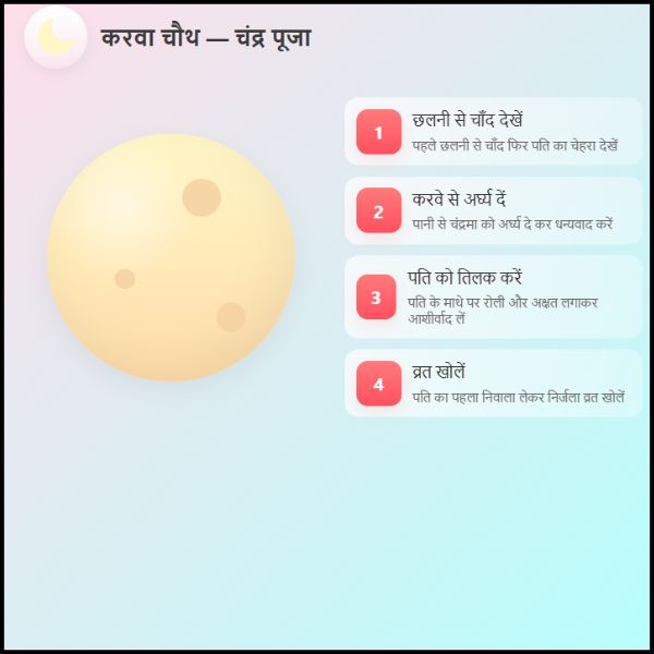 | करवा चौथ के दिन चंद्रमा की पूजा कैसे करें? | चाँद निकलने के बाद छलनी से देखकर अर्घ्य दें और पूजा करें |
