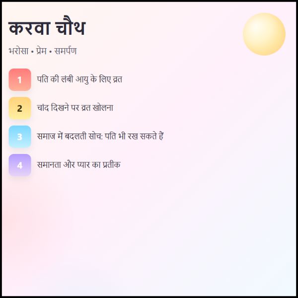 - आजकल करवा चौथ को आधुनिक अंदाज़ में भी मनाया जाता है, जहाँ पति-पत्नी दोनों मिलकर व्रत रखते हैं और एक-दूसरे के लिए उपहार भी खरीदते हैं।