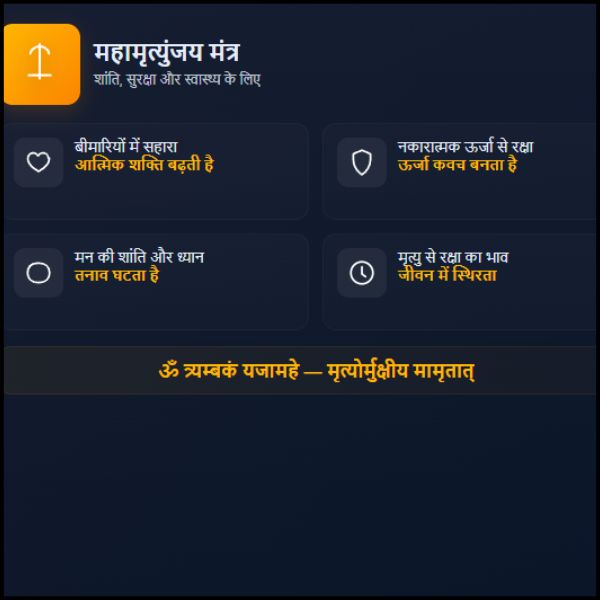नाम से ही स्पष्ट है। यह “मृत्यु पर विजय पाने वाला मंत्र” है। यानी जीवन के कठिन क्षणों में यह मंत्र व्यक्ति को बचाने वाली दिव्य ढाल बन जाता है। - मानसिक शांति और ध्यान: