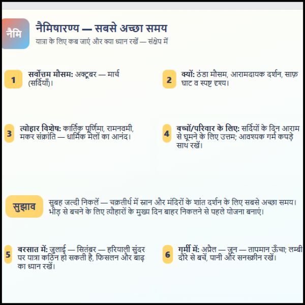 | नैमिषारण्य यात्रा टिप्स? | हल्के कपड़े, पूजा सामग्री और पानी साथ रखें। |