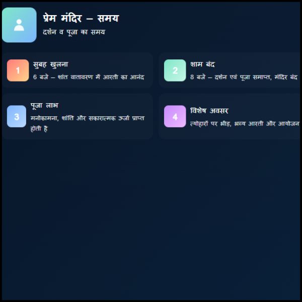 अब आते हैं आपके मुख्य सवाल पर। प्रेम मंदिर कितने बजे खुलता है और कितने बजे बंद होता है, इसका जवाब इस प्रकार है: