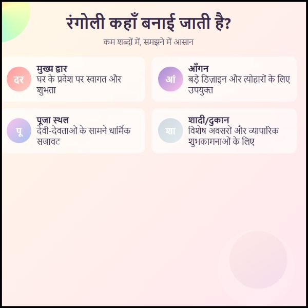 तो दोस्त, अब आपको साफ-साफ समझ आ गया होगा कि रंगोली कहाँ बनाई जाती है? रंगोली सिर्फ दरवाज़े की सजावट नहीं है बल्कि यह हमारी परंपराओं, धार्मिक आस्था और सकारात्मक ऊर्जा का प्रतीक है। चाहे घर का मुख्य द्वार हो, आँगन हो, पूजा का स्थान हो या फिर शादी और त्योहारों का अवसर – रंगोली हर जगह अपनी चमक बिखेरती है।