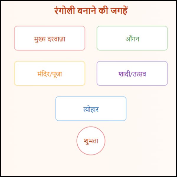 रंगोली सिर्फ रंगों का खेल नहीं है, बल्कि ये हमारी संस्कृति और परंपरा की पहचान है। घर के दरवाज़े, आँगन, मंदिर या शादी के मंडप – हर जगह बनी रंगोली अपने आप में एक सकारात्मक संदेश देती है। ये हमें बताती है कि जीवन में रंग, सामंजस्य और खुशियाँ कितनी ज़रूरी हैं। रंगोली बनाने की जगह और उनका महत्व