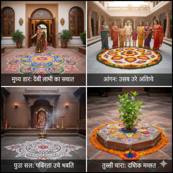 आँगन में बनी रंगोली सिर्फ सजावट नहीं बल्कि लोगों के मिलने-जुलने और मिलकर उत्सव मनाने की पहचान भी है। आज भी गाँवों में आँगन की रंगोली त्योहार की शान मानी जाती है।