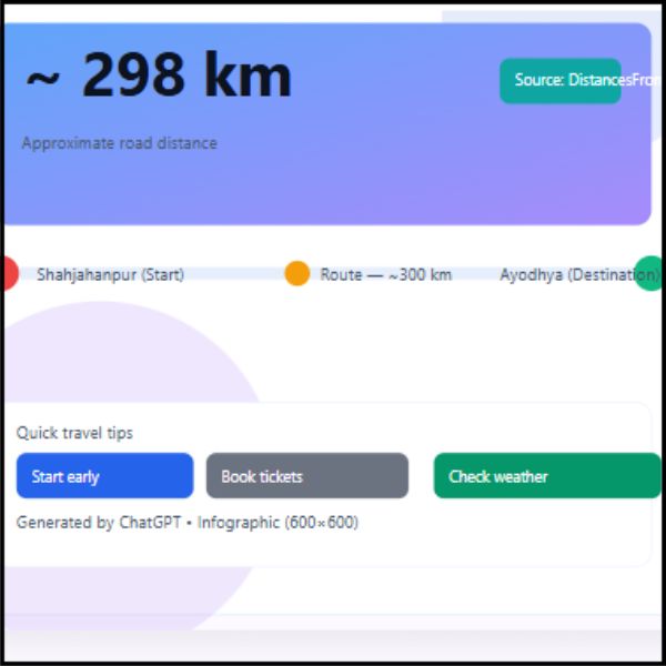 Shahjahanpur से Ayodhya की दूरी — चाहे शारीरिक हो या भावनात्मक — दोनों सहज है। लगभग 300 किलोमीटर, और 5–6 घंटे — इतनी दूरियाँ अक्सर रोजमर्रा की यात्रा जितनी ही होती हैं।