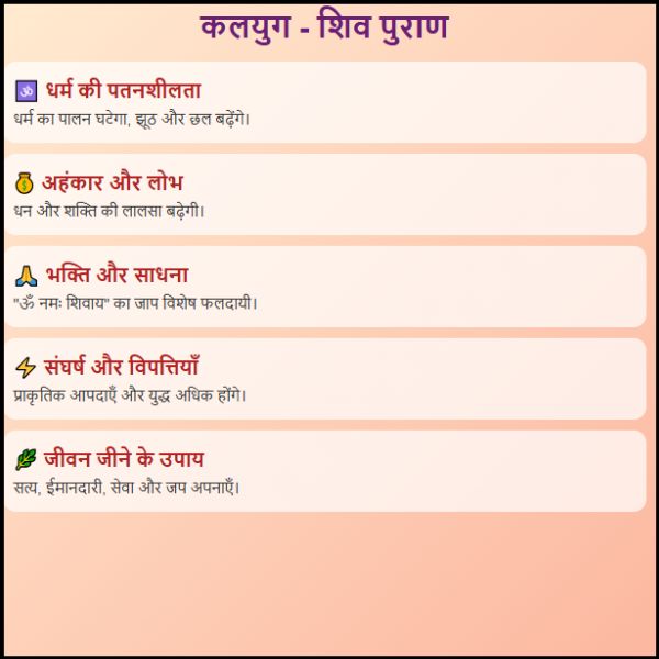शिव पुराण हमें कलयुग के बारे में कई महत्वपूर्ण बातें बताता है। मैं इसे कुछ मुख्य बिंदुओं में समझा रहा हूँ, लेकिन flow में ताकि पढ़ने में मज़ा आए।