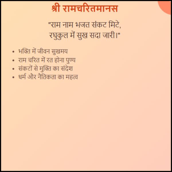 5. धर्म और भक्ति का संगम: इसमें जीवन के आदर्श और भक्ति का संपूर्ण मेल दिखाई देता है।