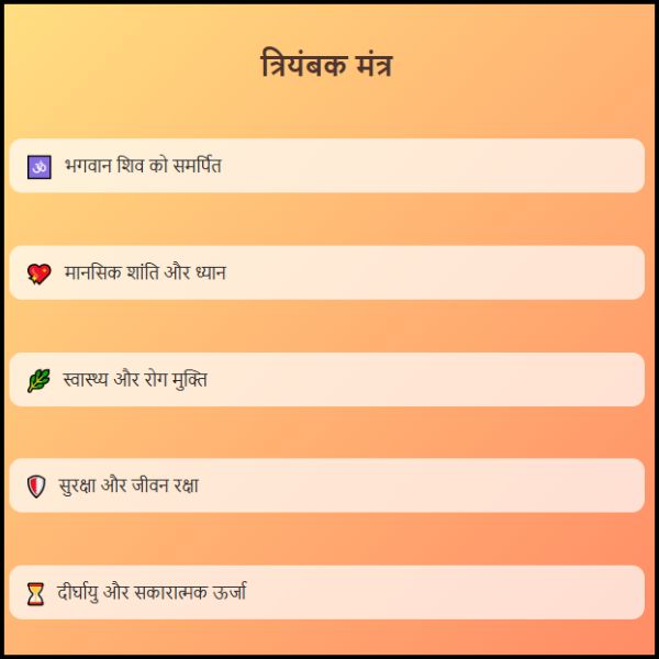वैज्ञानिक दृष्टिकोण से देखा जाए तो इस मंत्र का नियमित उच्चारण मस्तिष्क की तरंगों को संतुलित करता है और ध्यान की क्षमता को बढ़ाता है। इसके अलावा, यह मंत्र आध्यात्मिक शक्ति बढ़ाने, नकारात्मक विचारों को दूर करने और मानसिक तनाव कम करने में भी मदद करता है। इसलिए, चाहे आप पूजा-पाठ में नए हों या ध्यान में रुचि रखते हों, त्रियंबक मंत्र को अपने दैनिक जीवन में शामिल करना बहुत फायदेमंद माना जाता है।