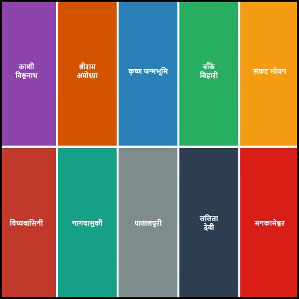 | 1 | काशी विश्वनाथ मंदिर | वाराणसी | भगवान शिव |